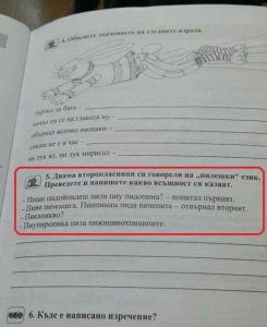 Задача от учебно помагало по български език за втори клас предизвика спорове в социалната мрежа Facebook. В условието от учениците се изисква да „преведат“ текст, написан на „пилешки език“. Текстът започва така: “Пище пидойпидеш пили пиу пидопима”.
