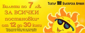 Спектаклите, за които можете да закупите билети на специалната цена от 7 лв., са заглавията, с които ще изпратим сезон 2016/2017. Посрещнете лятото в Театър “Българска армия”: